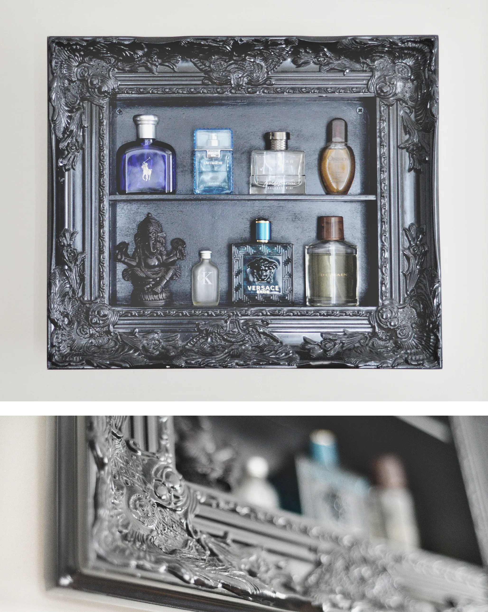 Ornate is a boutique wall mounted shelf . Featuring a refinished and repurposed picture frame, this project encompasses the enticement of a shadow box with the functionality of a wall shelf. Originally designed to hold colognes and other small objects, Ornate has the possibility to hold more with its customizable and removable shelf.