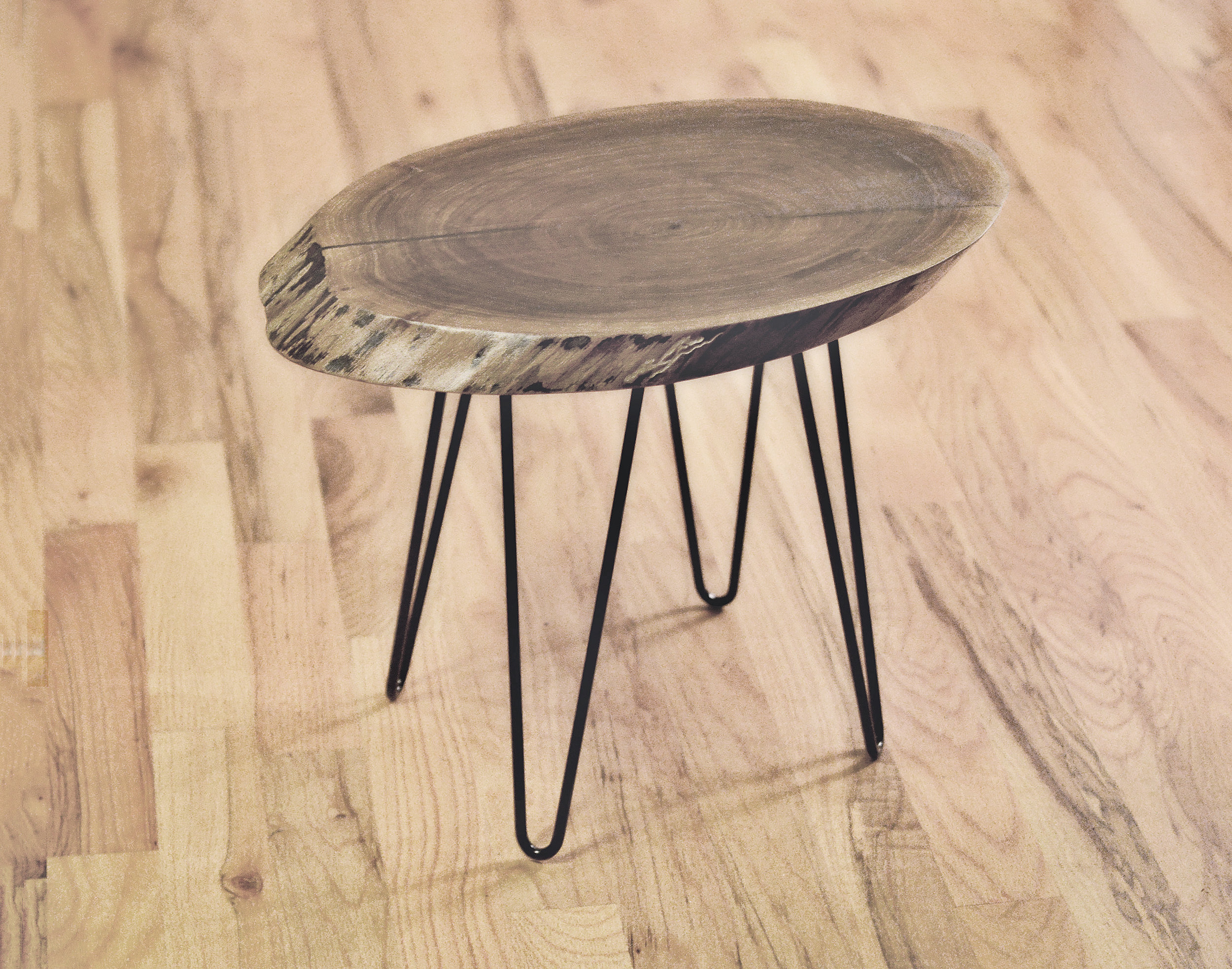 Raw is small side table embellishing the natural characteristics of live edge wood, juxtaposed with the clean fabricated look of midcentury-modern hairpin legs. The table surface is a solid piece of a black walnut live edge slab that was planed, sanded, and oiled to finish. This table is approximately 24 inches long, and 16 inches in width and height. Leaving out lacquers and urethanes allows the user to feel the actual surface of the wood as well as the finished live edge. 16 Inch hairpin legs were provided by I-Semble