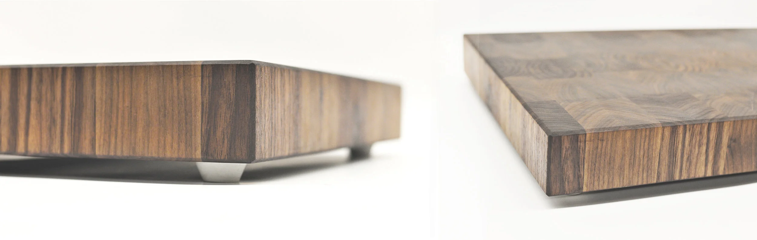 Blox is a series of end grain walnut cutting boards. Blox features a hand sanded chamfer, as well as rubber footing. Due to the orientation of the fibers, "end grain" cutting boards accept knife blades more than "edge grain" boards - prolonging the overall integrity of the board, as well as the blade of the knife.