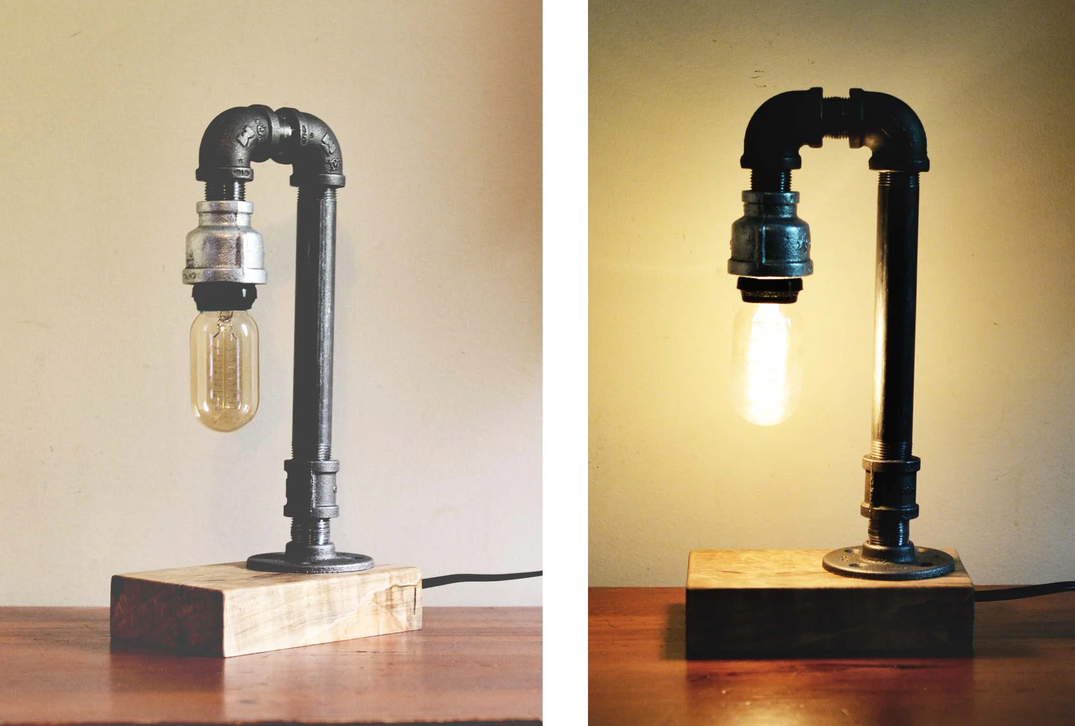 Constructed on a base of Ambrosia Maple, this desk lamp features galvanized steel piping, and an amber-tinted coiled Edison lightbulb. Approximately 14 inches tall, with a 5 foot switch plug, Edison serves as functional decor with a modern-industrial feel.